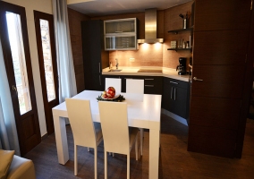 - A tan solo un par de pasos de la cocina se hace hueco la mesa del comedor, de color blanco y que ofrece a los huéspedes un lugar acogedor para disfrutar de una rica comida o cena especial con la comodidad de tener todos los utensilios de la cocina al alcance de la mano.