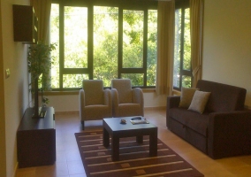 - Sala de estar con comedor integrado, de estilo muy moderno y sencillo a la vez que minimalista. Dispone de un cómodo sofá oscuro a juego con el mobiliario y la televisión. Con 2 confortables sillones color crema y muy buenas vistas del jardín y la montañosa región gallega. Una planta completa la decoración de esta iluminada área, enfocada al relax rural.