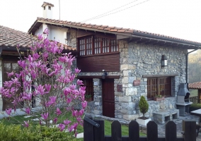 La fachada, como es típico en la zona, tiene piedra y madera, rodeada de césped y vegetación.