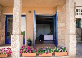 Se trata de un conjunto de alojamientos dentro de la misma finca, donde la fachada en piedra se ve combinada con detalles de color azul, y en la planta baja, con plantas de colores.