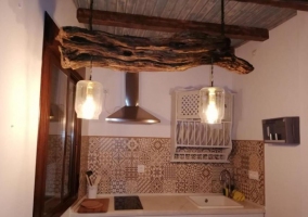 - Una agradable cocina office, en la que tenemos una encimera con todos los electrodomésticos y el menaje necesarios, y en paralelo, una zona office con barra y superficie de madera, y un par de taburetes en madera para que podáis comer tranquilamente.