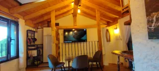 - Una zona de estar agradable, en la que vas a encontrar un confortable sofá tapizado en el que vas a poder descansar después de hacer turismo por la zona al calor de la chimenea de forja. Al lado, tenemos zona de comedor, equipada con una mesa grande y sitio para que podáis comer tranquilamente mientras veis la televisión de plasma, que está anclada a la pared.