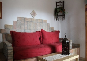 - Salón: muy luminoso. Paredes en blanco liso completadas con elementos de labranza. Cuenta con un peculiar sofá, nacido en ladrillo con acolchado, que se sitúa frente a la televisión.
