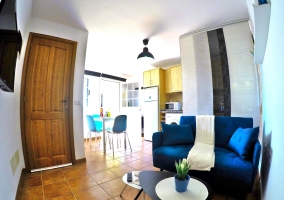 - Sala de estar, situada junto a la entrada de la habitación, y en la que se sitúan un bonito sofá en un intenso color azul y una pantalla de televisión.