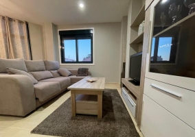 - Un amplio salón en el que tenemos 2 ambientes. Por un lado, tenemos una zona de descanso que comunica con la cocina y el comedor y que cuenta con un confortable sofá que se convierte en una cama doble y que mira hacia el frente en el que tenemos la televisión de plasma integrada en el mueble. Al lado, una zona ideal para relajarse y leer con un par de sillas relax.
