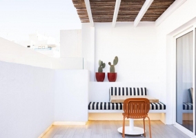 - Una amplia terraza privada que dispone de una zona chill out techada con sillones y mesa, junto a un solárium con dos hamacas.