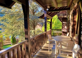 - Un amplio salón con suelos y muebles de madera, en el que tenemos un conjunto de sillones que miran directamente hacia el frente en el que tenemos tanto la televisión de plasma, como la chimenea de leña que le aporta un toque muy familiar y agradable. Además, desde este espacio, hay acceso a la terraza.