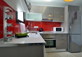 - Una moderna cocina en gris y rojo, que cuenta con una encimera en forma de L en la que vas a encontrar el conjunto de los electrodomésticos y el menaje necesarios para poder hacer todos los platos que quieras. La pared de color rojo aporta un toque de color a la estancia.