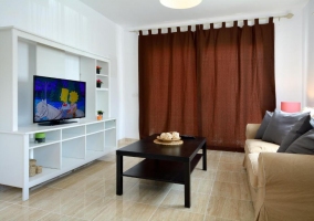 - La sala de estar se encuentra al lado de la cocina, y dispone de un cómodo sofá que se puede convertir en cama individual, y al que precede una mesa en color negro con un centro de mesa. De frente, un mueble de color blanco en el que se encuentra la televisión de plasma.