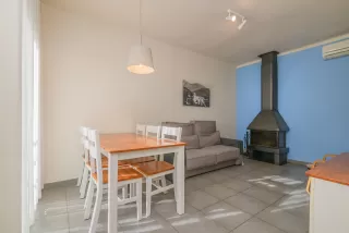 - ¿Cómo nos aseguramos de que os encontréis tan estupendamente entre nuestras casas? Pues con las mejores calidades. Empezando por el salón que, no solo cuenta con mesa de comedor y televisor, también tiene una chimenea que calentará toda la sala.