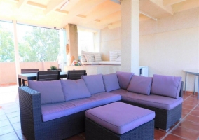 - Varias terrazas amplias. Una de ellas a la entrada, con mesa y toldo, y otras en la planta superior con varios espacios de descanso con sillones, otro para comer con mesa y zona de barra a cubierto que comunica con la zona de barbacoa.
