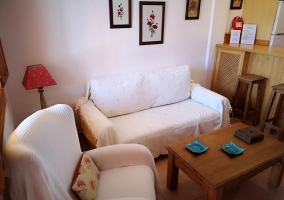 - Un saloncito completo. En él hay una televisión, un sillón y un sofá de color beige clarito. Los muebles son de madera a juego con los de la cocina.