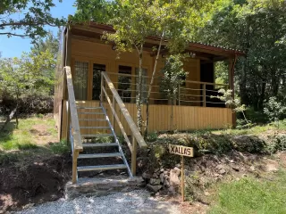 - Cabaña de 2 habitaciones (Xallas, A Ruña, A Moa, O Pindo). Unas preciosas cabañas con un interior repleto de comodidades que podréis disfrutar un máximo de 4 personas. En su interior: salón con sofá, televisión y una mesa de comedor; 2 habitaciones cada una de ellas con una cama de matrimonio; un baño equipado; y un porche con un rincón de estar con sillas de madera o mesa de picnic, según el alojamiento.