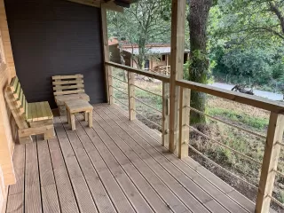 - Cabaña de 35 m2 (Mónica), accesible para personas con movilidad reducida. Es un alojamiento que te recibe con una maravillosa terraza con muebles de exterior, que dejan paso a la zona en la que tenemos una amplia cama de matrimonio frente a las enormes cristaleras, y un espacio con jacuzzi que también dispone de ventana panorámica junto a la zona de la ducha. Mesa de comedor y una zona de estar con su sofá cama. Incluye desayunos.