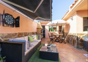 - En la parte exterior de la propiedad encontramos una enorme terraza que rodea a la finca, en la que se han dispuesto varias zonas diferencias según su uso posterior, habiendo justo a la salida desde el salón un porche bajo el que se ha instalado un saloncito de exterior;en la otra zona más cercana a la salida de la cocina, hay una mesa a modo de cenador bajo una sombrilla de gran tamaño cerca de la barbacoa de obra. Un poco más allá encontramos en lo que sería el área de transición entre una y otra, un tresillo de exterior, bajo una diana.