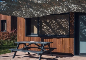 - Una zona privada en forma de porche de madera, con una mesa oscura con bancos donde podéis comer.