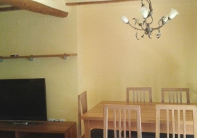 - Un salón comedor amplio, en el que tendréis las mejores vistas de los exteriores. Tenemos un conjunto de sillones, que miran hacia el frente en el que se encuentra el mueble de madera con la televisión. En una esquina tenemos la estufa de pellets, y delante, una mesa de madera con su conjunto de sillas.