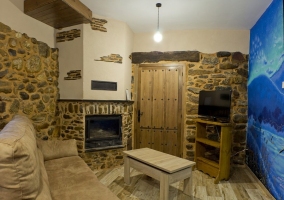 - La zona de salón tiene el sofá que es cama, y que se encuentra junto a la televisión de plasma, y justo en una esquina, la chimenea de leña en piedra.