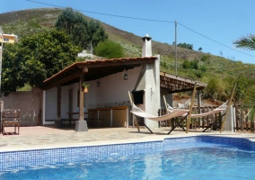Al lado de la casa hay un espacioso cenador de obra, donde está instalada la barbacoa. Al lado de ella, tienen una encimera con un fregadero para que las comidas o cenas que se preparen allí, se hagan de la forma más confortable posible. También hay una mesa larga con bancos de madera.