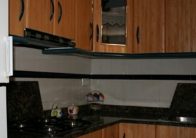 - Cocina completa. Avanzando por el salón llegaréis a la cocina, de la que se encuentra separada por una barra de estilo americano. En ella dispondréis de mobiliario de madera y encimeras de color oscuro, sobre las que podréis cocinar vuestros platos favoritos. Para ello, contaréis con todo tipo de utensilios y menaje.