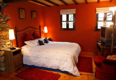 En la segunda planta se encuentra el dormitorio y el cuarto de baño. El dormitorio tiene un estilo muy rústico, que le aportan los cabeceros de madera y las bonitas paredes de piedra, aportándole un toque de modernidad, la cuarta pared roja. Además, disfrutaréis de bonitas vistas gracias a las amplias ventanas, con contraventanas para resguardaros del frío. El cuarto de baño, por su cuenta, está completo y en él podréis encontrar la ropa de aseo necesaria.