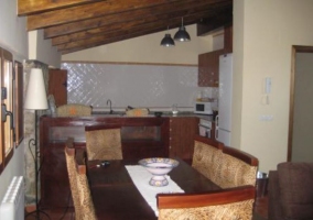 - Un elegante salón comedor con mucha luz, que transmite paz gracias a sus tonos blancos combinados con la madera. Dispone de un conjunto de sillones en los que vas a poder relajarte mientras ves la televisión de plasma al calor de la chimenea de leña que hay delante. Al lado, una mesa de comedor amplia, con su conjunto de sillas y junto a los ventanales.
