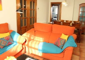 - Un espectacular y elegante salón comedor en el que por un lado se encuentra la mesa de madera con sillas, junto a una alacena en madera y cristal con las copas. La zona de descanso tiene un conjunto de sillones que miran hacia el frente en el que se encuentra el mueble con la televisión de plasma, y a su lado, un ventanal que aporta muchísima luz a todo el espacio.