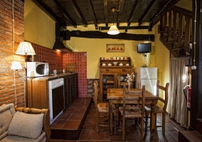 - En la planta baja encontrarás un amplio espacio compartido por el salón y la cocina-comedor con sofás, mesillas, calefacción, ventanas, electrodomésticos (nevera, horno, microondas, lavadora y menaje) bajo un techo de madera con vigas y una pared de piedra
