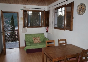 - Un salón que comparte también el espacio con la zona de comedor. El salón comedor tiene sofá tipo diván con opción de habilitarlo como cama individual, mesa para 4 comensales y televisión con dvd y conectores usb. También en el comedor hay información turistica de la zona y juegos de mesa.