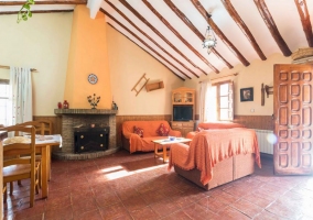 - Un amplio salón con sofás junto a una televisión de plasma y una gran chimenea que realiza la función de dividir esta zona con el comedor, en el que hay una gran mesa de madera con sillas.