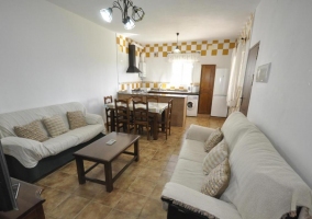 - Un amplio salón comedor en el que tenemos un conjunto de sillones en los que disfrutar del mejor descanso mientras ves la televisión de plasma que hay en el mueble que tenemos justo delante. Al lado, una chimenea en forja que hace esquina, mientras que al lado, tenemos una mesa de comedor en madera con sillas.
