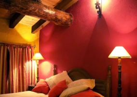 - Un espacio para dormir que protagoniza la amplísima cama de matrimonio que se viste con sábanas y mantas agradables, y que se complementa con algunos elementos del mobiliario. Junto a ella, la chimenea de leña que está haciendo esquina y que proporcionará una temperatura óptima.