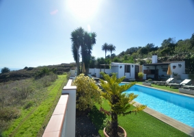 - Una zona ajardinada en la que se encuentra la piscina, que se ha rodeado de hamacas.