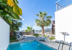 - Un espacio de piscina alargada, con hamacas alrededor.