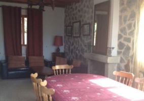 - Un salón comedor amplio y luminoso donde hay 2 ambientes. Por un lado el de descanso, con varios sillones que dejan vistas directas de la televisión, y por otro lado, una enorme mesa de madera en tonos claros a la que acompaña un conjunto de sillas. Además, en el centro y como nexo entre ambos, una enorme chimenea de leña muy útil en invierno.