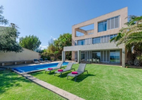 - Una impresionante piscina orientada hacia el mar y rodeada de zonas verdes en las que se encuentran varias hamacas.