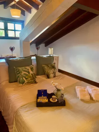 La cama de matrimonio reside el espacio principal, y está serparada del resto por unas vigas de madera a modo de biombo para separar los dos ambientes.