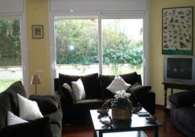 - Un salón comedor amplio con grandes cristaleras de acceso a las zonas exteriores donde tenemos los sillones, que miran hacia el frente en el que está la televisión. Al otro lado de la sala, la mesa de comedor con su conjunto de sillas, y en el centro, la chimenea de leña, de tipo francesa.