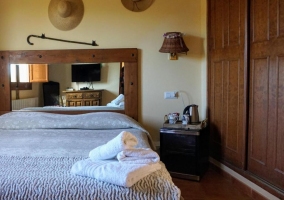 - Habitación familiar. Es una estancia en la que se pueden alojar hasta 4 personas. Cuenta con una cama de matrimonio extragrande y 2 camas individuales. Su temática está representada en sombreros típicos de distintas partes del mundo que cuelgan de las paredes. El cuarto de baño tiene un plato de ducha grande con suelo de baldosas.