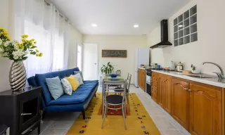 - Una zona de estar en la que tenemos la cocina alargada, frente a la que hay una mesa y al lado, un sofá cama perfecto para niños.