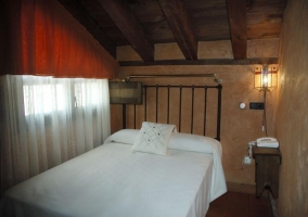 Esta habitación cuenta con una cama de matrimonio, coronada con un cabecero antiguo. Tiene además otros muebles y elementos tradicionales, como vigas de madera y distintos elementos restaurados, como las mesillas.